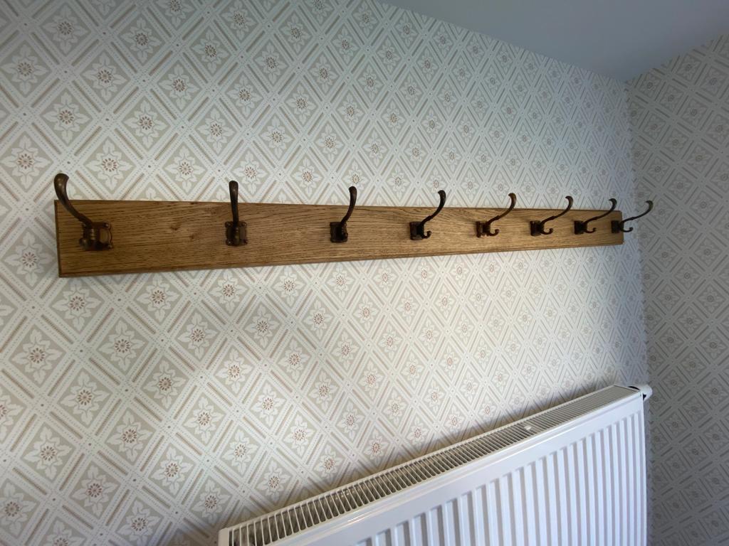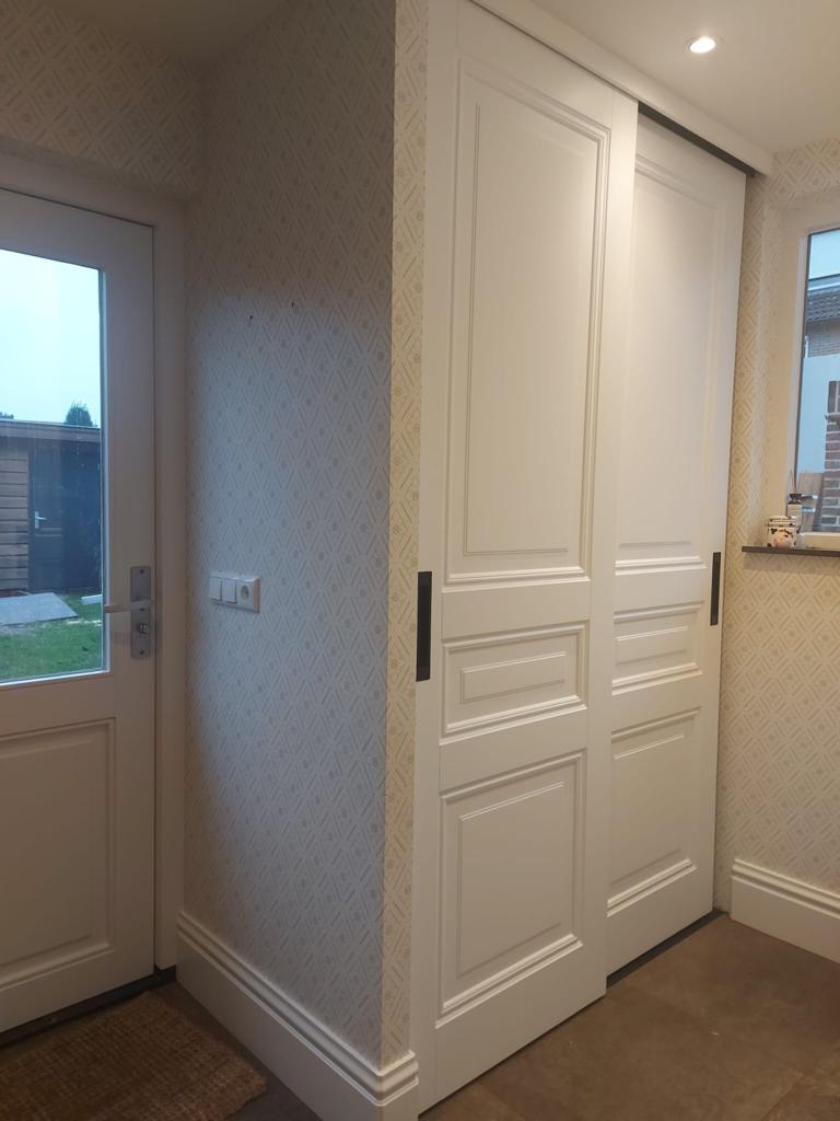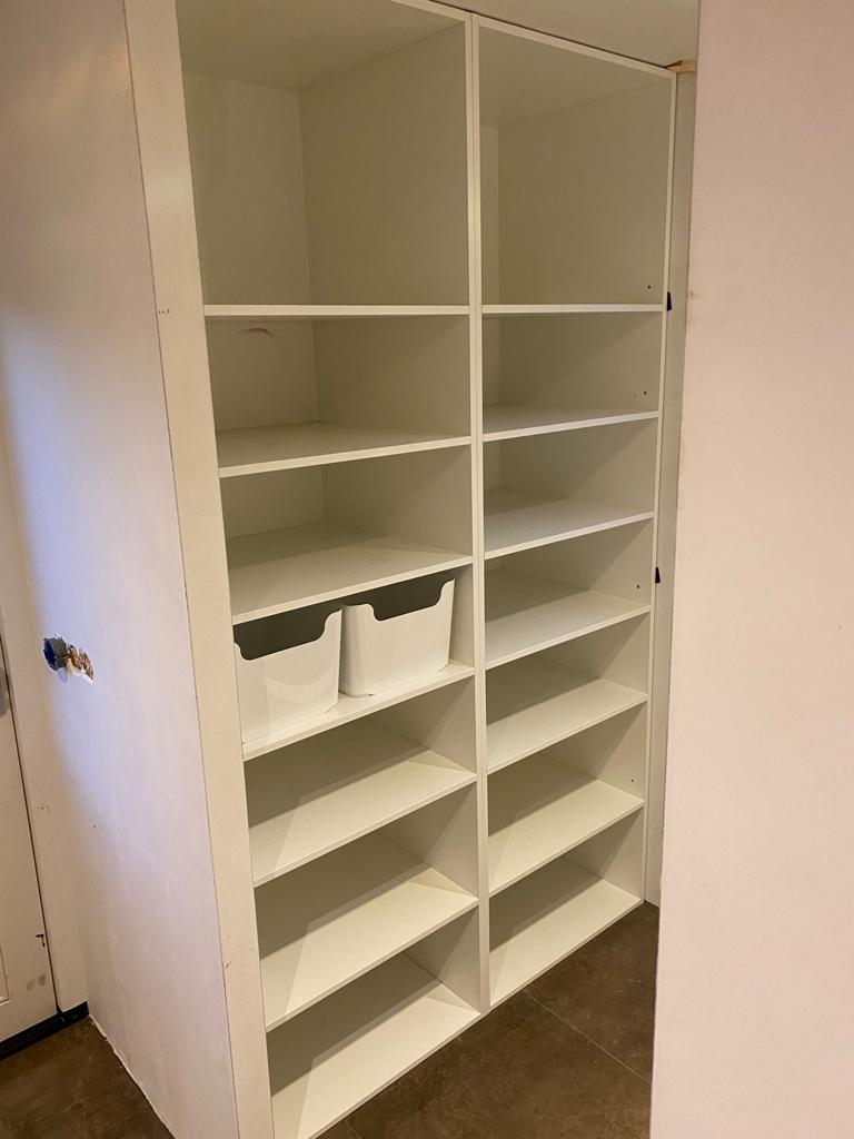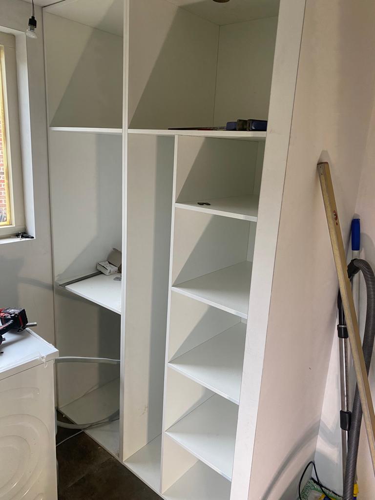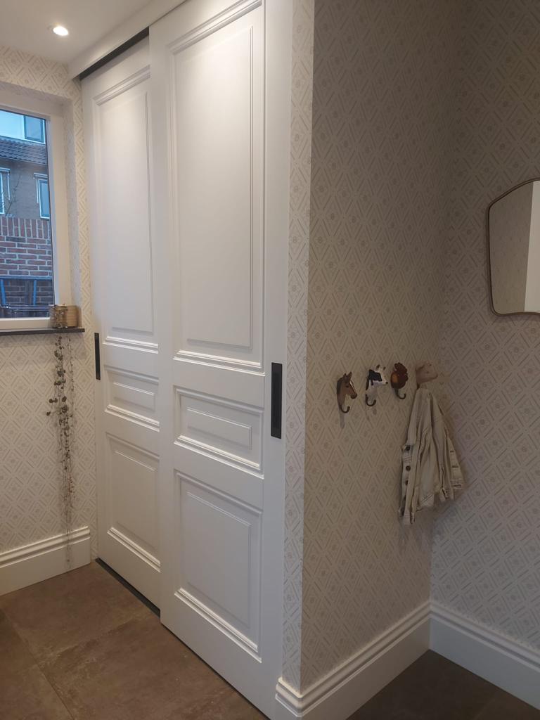 We hebben dit project van begin tot eind verzorgt, en het heeft een mooi eindresultaat opgeleverd. Er zijn aansluitingen gemaakt voor de wasmachine en droger, die netjes boven elkaar in de kast staan. En als de schuifdeuren dichtzitten, zijn ze aan het oog onttrokken. Zelfs de eikenhouten kapstok is door ons geheel naar wens van de klant gemaakt.
